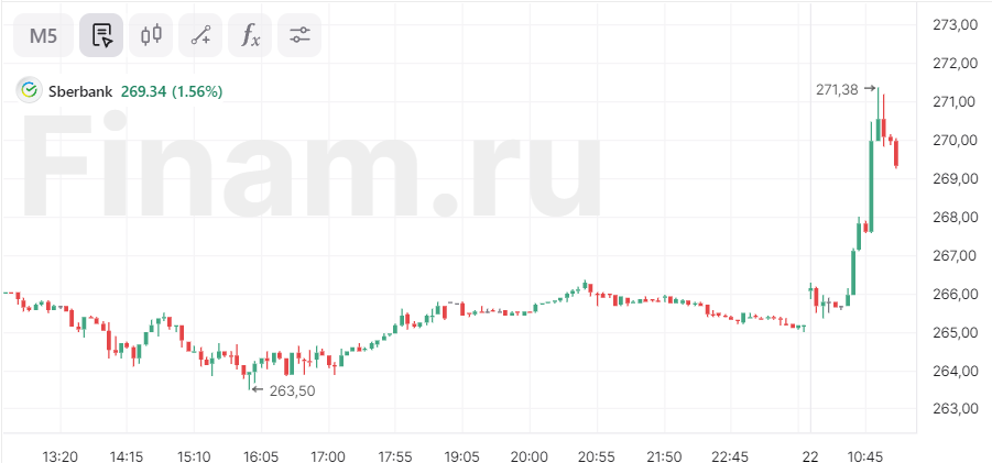 К 11:14 мск котировки «Сбера» прибавляют 1,56%, до 269,34 рубля за акцию, следует из данных торгов на Мосбирже.