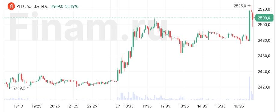Акции «Яндекса» к 17:27 мск дорожают на 3,35%, до 2709 рублей.