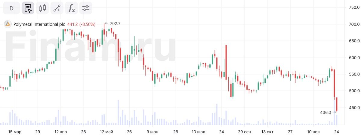 Бумаги Polymetal падают в пятницу, 24 ноября, второй день кряду на корпоративных новостях. Вчера появились сообщения о том, что компания намерена совершить обмен заблокированных в НРД акций на новые бумаги, теперь уже выпущенные в Казахстане.