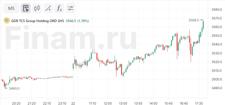 К 17:53 мск, расписки TCS Group прибавляют 1,78%, до 3 466,5 рублей за акцию, свидетельтсвуют данные торгов на Московской бирже.