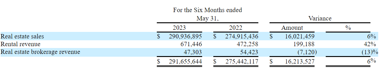 Выручка Metros Development за 6 месяцев, закончившихся 31 мая 2023 года, выросла на 6% (г/г) до $291,7 млн, что в основном связано с ростом продаж недвижимости. Компания функционирует в трех сегментах: продажа недвижимости (приносит 99% выручки), аренда, брокерские услуги. За 6 месяцев 2023 года сегмент продажи недвижимости укрепился на $16 млн благодаря тому, что компания заключила 67 договоров купли-продажи (+12 (г/г)). Расширение договорной базы связано с увеличением числа сотрудников блока продаж и количеством обращений к владельцам недвижимости. По причине роста числа арендаторов существенно изменился сегмент аренды (+42 (г/г)).