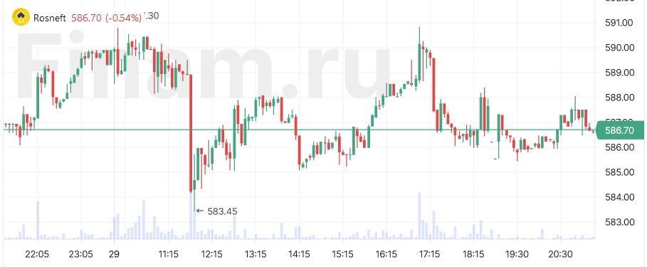 Акции «Роснефти» сегодня на вечерней сессии слегка снижаются – к 21:20 мск они опускаются на 0,54%.
