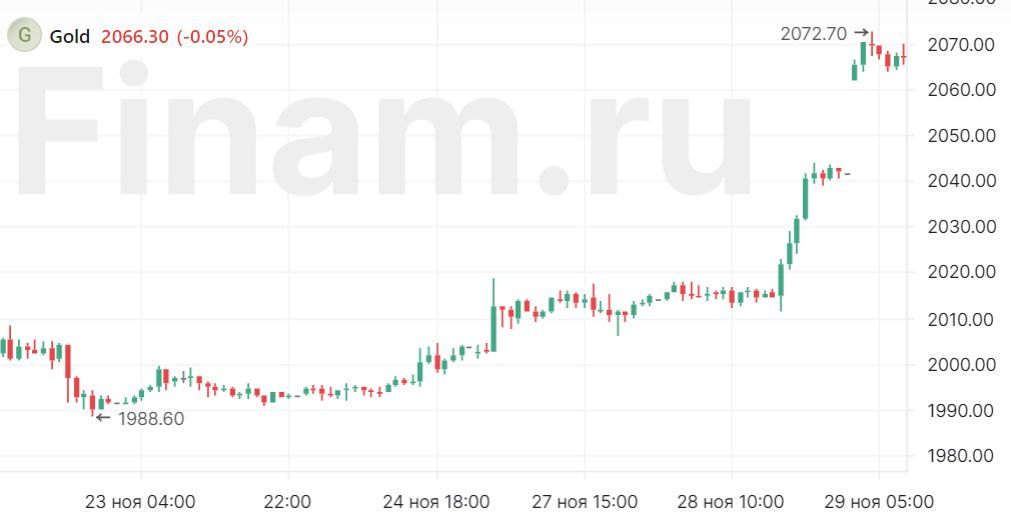 Золото после вчерашнего мощного рынка и достигнутого нового локального максимума на уровне $2072,7 за унцию, в моменте перешло к коррекции и расположилось на отметке $2066,5 (-0,05%).
