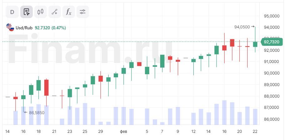 Вопреки росту нефтяных котировок, рубль уступает доллару и евро, более того, в моменте доллар поднялся до 93 рублей. Евгений Локтюхов, руководитель направления «Анализ отраслей и финансовых рынков» ПСБ, говорит о том, что новостные риски предстоящих выходных и «короткая» торговая неделя настраивают на сохранение нервозности у спекулятивных участников. «Но я считаю, что доллар останется в диапазоне 91,5-93 рублей, — повышенное предложение валюты со стороны экспортеров, естественное перед налоговыми выплатами 28 февраля, по моему мнению, способно нивелировать всплески давления на рубль», — пояснил он.