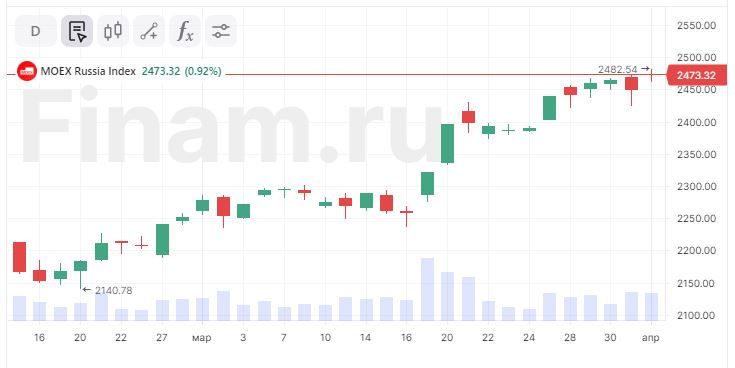 В первые торги апреля российский рынок показал разнонаправленное движение. На закрытии торгов понедельника индекс МосБиржи вырос на 0,9% — до 2473,32 пункта, индекс РТС ослаб на 0,8% — до 988,8 пункта. Отсутствие единства объясняется ростом доллара.