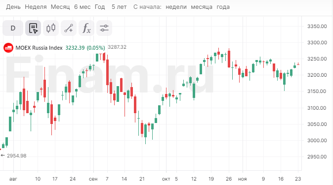 Торги на российском рынке акций утром в четверг, 23 ноября, проходят в плюсе. Индекс МосБиржи подрастает на 0,08%, до 3233,13 пункта, РТС — на 0,36%, до 1156,04 пункта.