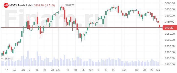 Российский рынок открыл торги в понедельник, 4 декабря, снижением ключевых индикаторов. Индекс МосБиржи в первые минуты основной сессии опустился на 1,19% до 3104,96 пункта, индекс РТС упал на 1,54% до 1078,39 пункта.